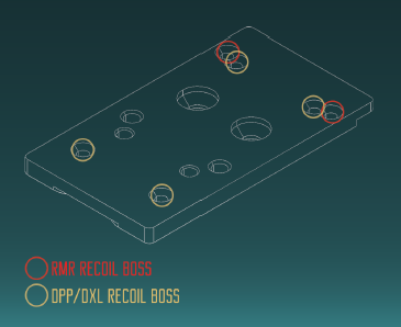 - Identify the correct recoil bosses and corresponding holes. The RMR recoil bosses with go to the front-most/furthest apart holes, and the DPP holes will be the ones closer towards the center of the slide (see diagram below). The recoil bosses will accept a 2mm hex drive or small flathead. Tighten them hand-snug with blue loctite. Do not exceed 2 in-lb of torque.
